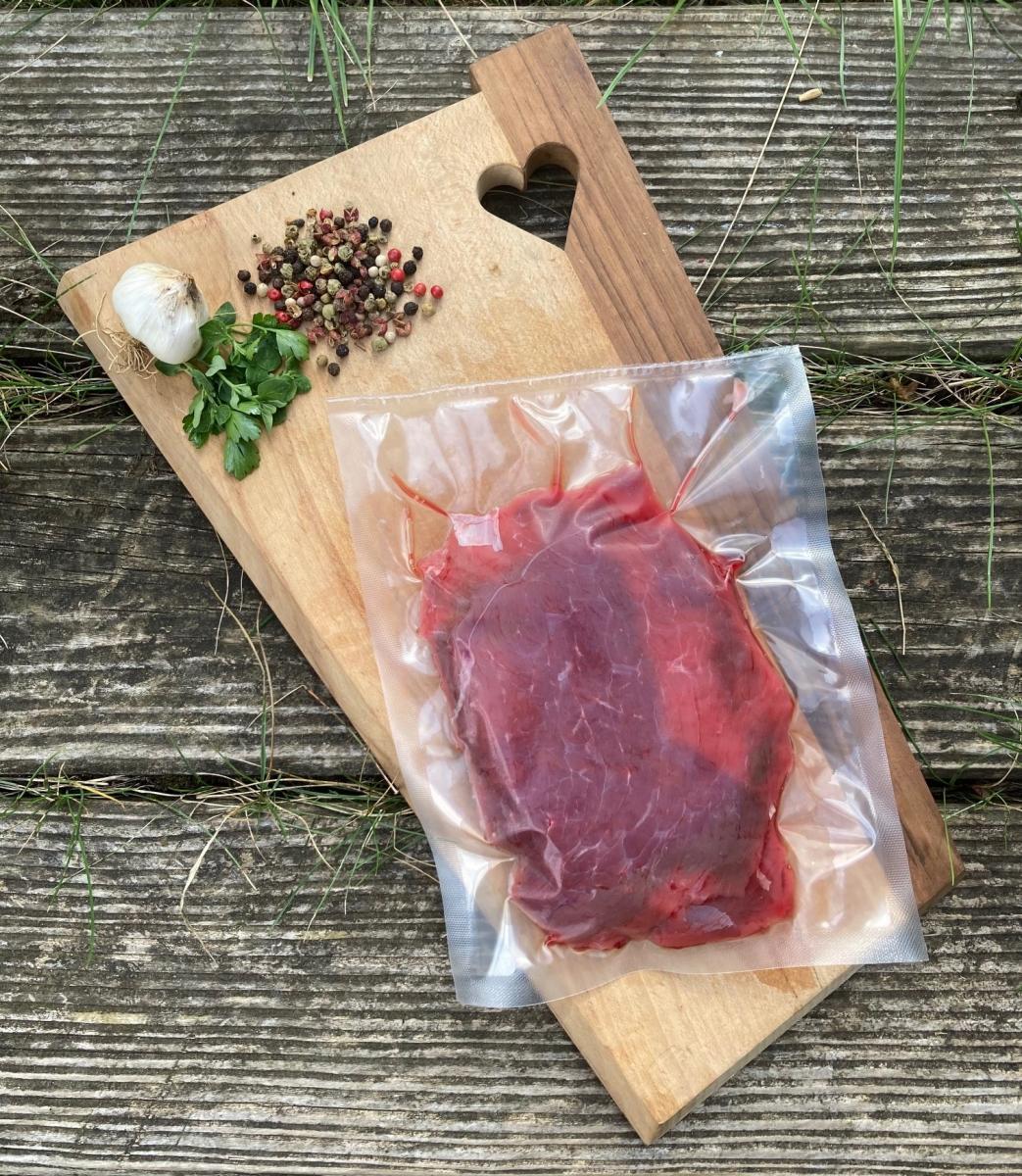 Steaks tendres de boeuf, race limousine, agriculture biologique, mis sous-vide.