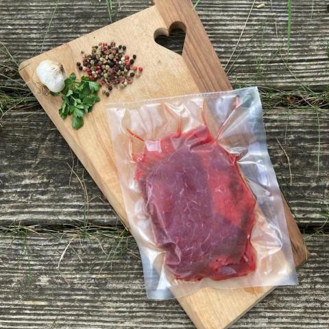 Steaks dans le rumsteack de boeuf, race limousine, agriculture biologique, mis sous-vide.