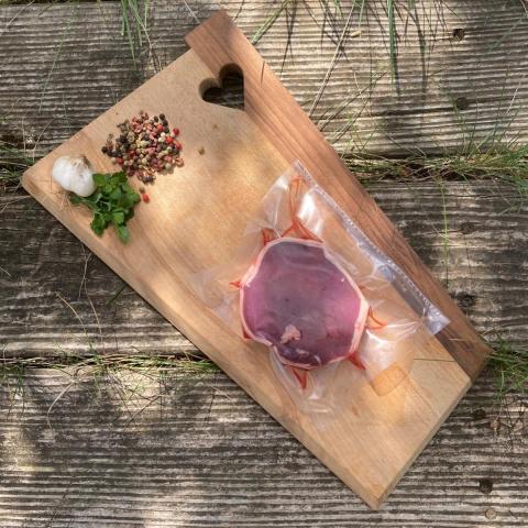Bande de barde de porc bio sur le dessus, merci de préciser si vous ne la souhaitez pas.