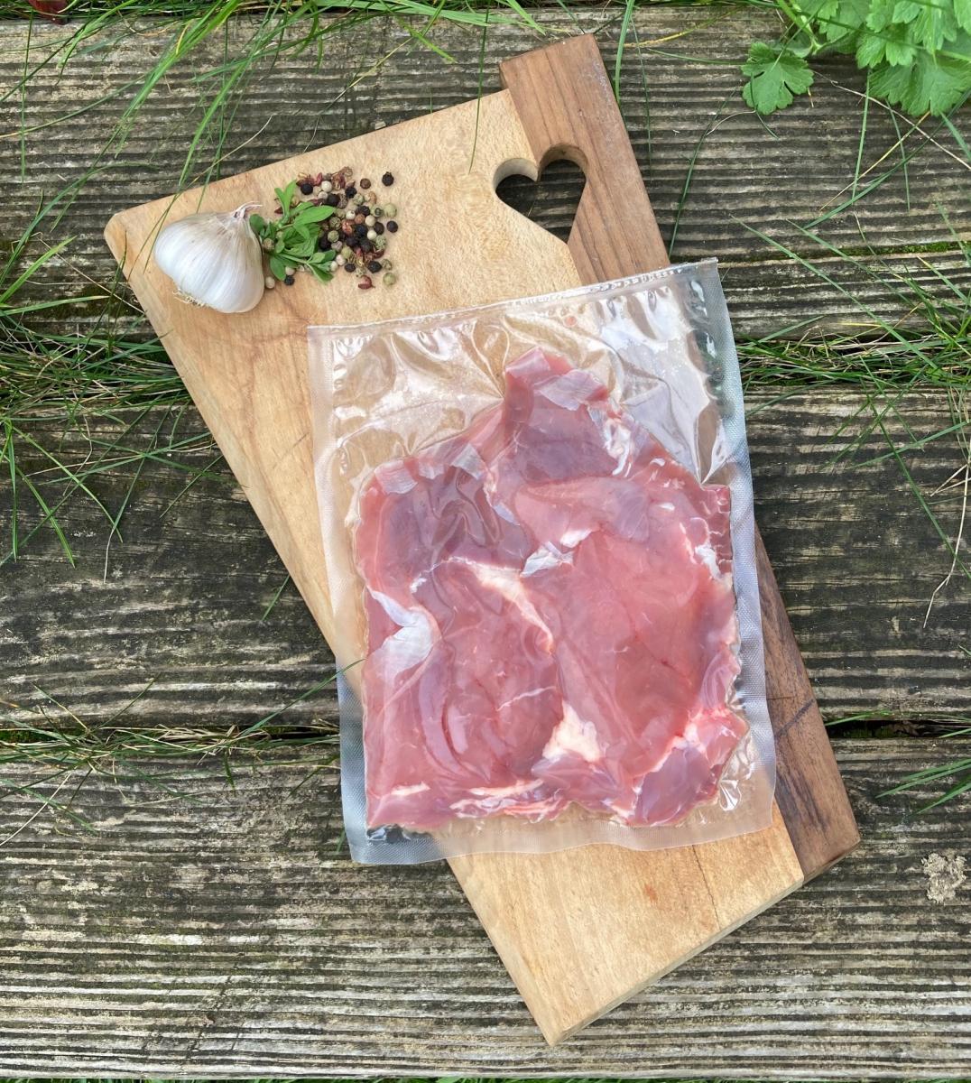 2 côtes de veau sans os (vers le faux filet), élevé sous la mère, agriculture biologique, mise sous-vide. Environ 300 grammes.